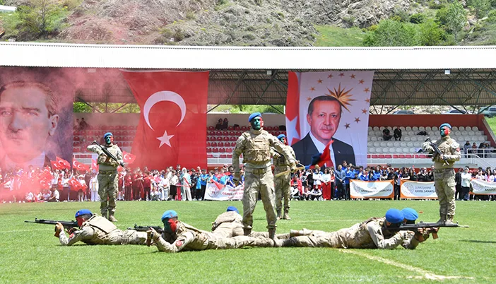 Yeni Şehir Stadyumu’nda gerçekleştirilen törende gençlerin hazırladığı sportif ve kültürel gösteriler izleyicilerden yoğun alkış aldı. Gümüşhane Valisi Aydın Baruş, tören alanındaki stantları gezerek gençlerle yakından ilgilendi ve etkinliklere katıldı.