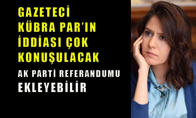 Habertürk Programcısı Gazeteci Kübra Par: "AK Parti 2023 seçimleri ile aynı gün başörtüsü ile ilgili referandum yapma olasılığını düşünüyor." açıklaması Ankara kulislerini hareketlendirirken bu durumun olası erken seçim ya da zamanında yapılacak seçimlere referandumun da eklenebileceği görüşünü öne çıkardı.