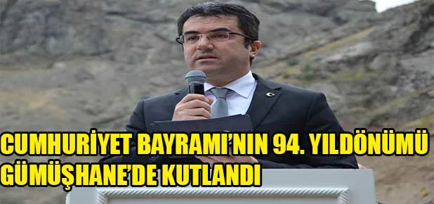 Vali Okay Memiş ve Belediye Başkanı Ercan Çimen’in vatandaşlarımızı selamlaması ve İstiklal Marşının okunmasıyla başlayan törende yaptığı konuşmada, milletimizin ezelden ebede uzanan tarih yolculuğunda çok önemli bir dönüm noktası olan Türkiye Cumhuriyeti’nin kuruluşunun 94. yılını, ülkemiz genelinde olduğu gibi, Gümüşhane’de de büyük bir coşku ile kutlandığını kaydeden Vali Memiş, “Bu anlamlı gün vesilesiyle, milletimizi, aynı coşku ve duygu ile aynı ortak paydada birleştiren, Cumhuriyetimizin kurucusu Büyük Önder Mustafa Kemal Atatürk ve silah arkadaşları başta olmak üzere, vatanımızın bölünmez bütünlüğü için mücadele ederken, rahmet-i Rahman’a kavuşan tüm şehitlerimizi, rahmet ve minnetle yâd ediyorum.