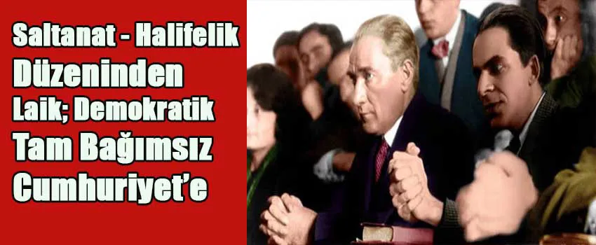 Atatürk, cumhuriyeti ilan etmeden önce saltanatı, cumhuriyeti ilan ettikten sonra da halifeliği kaldırmıştır. 1923 Cumhuriyet Devrimi’ni yaratan Mustafa Kemal Atatürk ve cumhuriyetin devrimci kadroları, modern Türkiye Cumhuriyetinin üç devrim yasası ile diğer İslam devletlerinden ayıran en önemli kimliği olan laikliğin temellerini atmıştır. Böylece toplumsal gelişmenin önünde engel olan çağdışı kurumlar kaldırılmış toplumu ve devleti din kuralları yerine, gelişen ve sürekli değişen ihtiyaçlar doğrultusunda, akla ve bilime dayalı ilkelerce düzenlemenin yolu açılmıştır.