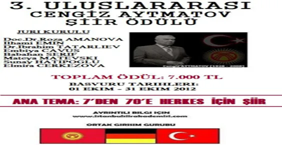 Ünlü Kırgız yazar, çevirmen, gazeteci, şair ve politikacı CENGİZ AYTMATOV anısına düzenlenen ‘’3. Uluslararası Cengiz Aytmatov Şiir Yarışması 2012 Etkinliği’’ tüm şiir severlerin katılımına açıktır. Tüm katılımcıların şiirleri antoloji kitabı olarak basılarak 1 adet gönderilecektir. Türkiye’de uluslararası bir jüriye sahip olan ilk şiir yarışmasıdır. Geçen yıl ikincisi gerçekleştirilen ve 200 den fazla şairimizin katıldığı etkinliğimiz siz değerli sanatseverlerin ve şairlerin desteği ile büyümeye devam ediyor.