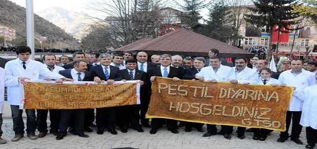 GTSO, oda tarafından hazırlanan ‘Sayın Cumhurbaşkanımız, memleketin gülü şehrimize hoş geldiniz, Pestil diyarına hoş geldiniz’ yazılı pestille Cumhurbaşkanı Gül’ü Fatih Parkında karşıladı.