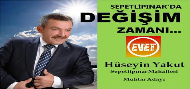 Afişte, Sepetlipınar’da değişim zamanı sloganı öne çıkarken muhtar adayı Hüseyin Yakut isminin önünde yer alan evet mührü dikkat çekiyor.