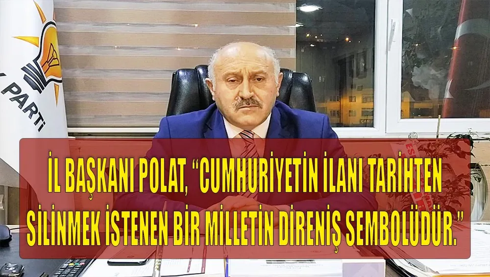 AK Parti Bayburt İl Başkanı Polat, 29 Ekim Cumhuriyet Bayramı dolayısıyla yayımladığı mesajında, “29 Ekim Cumhuriyet Bayramı, tarihte eşine az rastlanır bir azmin neticesi ve tarihten silinmek istenen bir milletin direniş sembolüdür.” dedi.