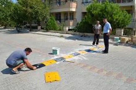 Altınoluk Belediyesi tarafından yapımı büyük ölçüde bitirilen kilit parke taşların üzerine plastik tümsekler büyük bir titizlikle belirli aralıklarda yerleştiriliyor
