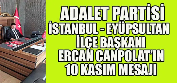 Adalet Partisi Eyüpsultan ilçe Başkanı Ercan Canpolat, Türkiye Cumhuriyetinin Kurucusu 1. Cumhurbaşkanı Mustafa Kemal Atatürk'ün vefatının yıldönümü nedeniyle bir mesaj yayınladı. Başkan Canpolat'ın mesajı şu şekilde:
