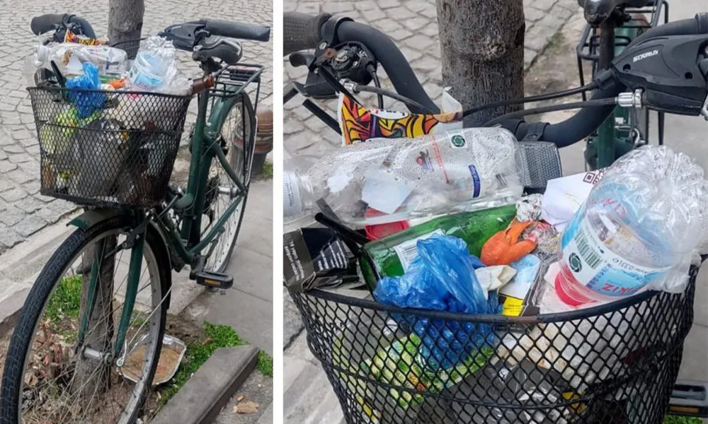 Uzun süre kimsenin sahip çıkmadığı bisikletin ön sepeti ve gövdesi, yoldan geçenlerin bıraktığı atıklarla doldu. Ortaya çıkan manzara, hem şaşkınlık yarattı hem de sokaklardaki sahipsiz eşyalara karşı duyarsızlığı gözler önüne serdi.