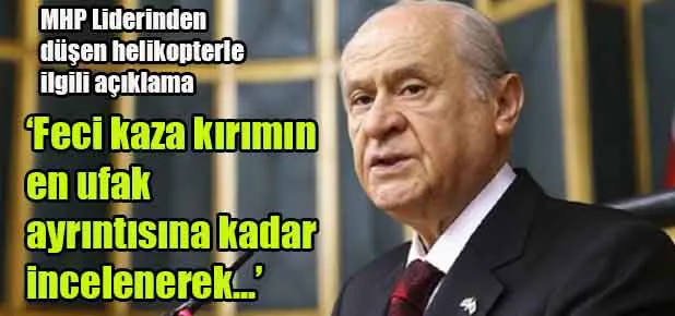 Milliyetçi Hareket Partisi Genel Başkanı Devlet Bahçeli “Şırnak’ın Uludere İlçesi Şenoba Beldesinde Düşen Helikopterle” ilgili açıklamalarda bulundu.