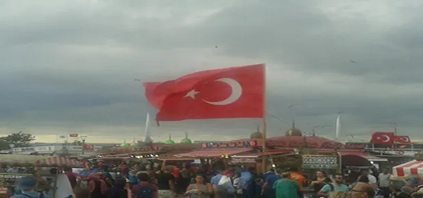 Eminönü’nde balık ekmek satışı yapan esnafta bu tepkisini tezgâhının başına diktiği dev Türk Bayrağı ile gösterdi.