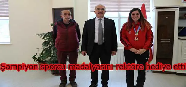 Türkiye Üniversiteler Eskrim Şampiyonasında üçüncü olan Gümüşhane Üniversitesi Beden Eğitim ve Spor Yüksekokulu öğrencisi İlayda Kayaoğlu madalyasını Gümüşhane Üniversitesi Rektörü Prof. Dr. Halil İbrahim Zeybek'e hediye etti.