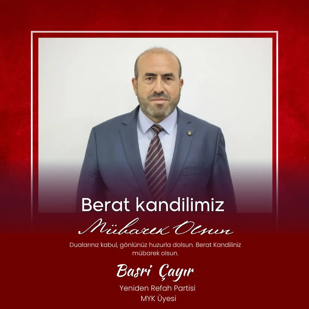 Bu mübarek gecenin, affa ve rahmete vesile olmasını diler, tüm gönüllere huzur ve bereket getirmesini temenni ederiz. Berat Kandiliniz mübarek olsun. Basri Çayır Yeniden Refah Partisi MYK Üyesi