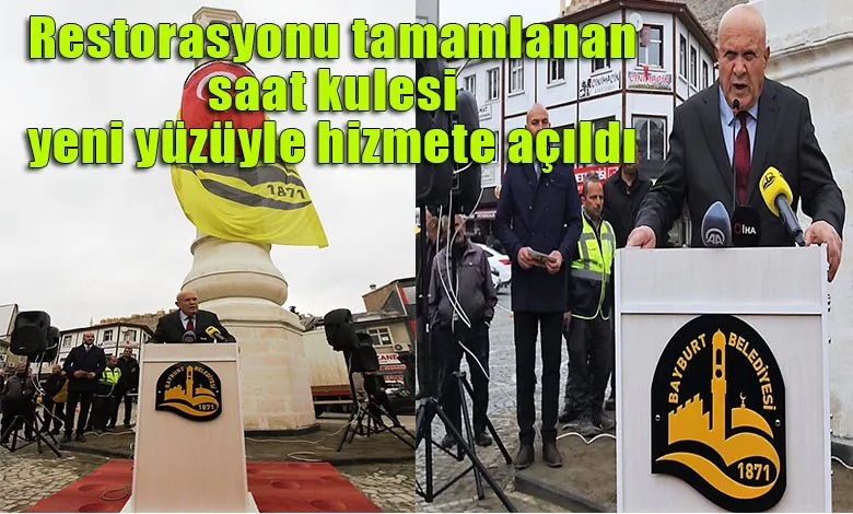 Bayburt Valisi Cüneyt Epcim de törende yaptığı konuşmada, “Bugün burada tarihi simge açısından Bayburt’un en önemli kültür varlılarından bir tanesi olan Bayburt Saat Kulesi’nin kültür varlıklarının korunması ilke kararları doğrultusunda restorasyonunun yapılması hepimizi mutlu etmiştir. Ve bu mutluluğu hepimiz de yaşıyoruz. Daha önce Bayburt Lisesi, Bayburt Kız Meslek Lisesi’nde, Bayburt Kalesi’nde yapılan restorasyon çalışmalarıyla birlikte Belediyemizin Bayburt Kalesi ile Saat Kulesi’ni en güzel şekilde göstermek amacıyla arkadaki binaların üst kısımlarının kesilmesi gibi başarılı kültür varlıklarının korunması alanındaki çalışmalar yapıldı. Bu gün burada da önemli bir eserin restorasyonu yapıldı. Restorasyon süresinde acaba Bayburt Saat Kulesi nasıl bir hal alacak diye epey bir merak konusu oldu. Ama bugün geldiğimiz noktada Bayburt Saat Kulesi’nin ilk yapıldığındaki taş kullanıldı. Saat Kulesi’nin ilk yapıldığındaki taş rengi bu şekildedir ve bu taş yıllar içerisinde sararacaktır. Bu manada kültür varlıklarının korunması ilke kararları doğrultusunda yapılan çalışmadan dolayı Belediye Başkanımız Hükmü Pekmezci Beyefendiyi tebrik ediyorum. Hayırlı olmasını temenni ediyorum” ifadelerini kullandı.