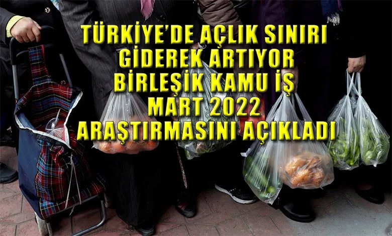 Birleşik Kamu - İş Konfederasyonu’nun Ar - Ge birimi KAMU - AR’ın, dört kişilik bir ailenin, dengeli ve sağlıklı beslenebilmesi için tüketmesi gereken gıda miktarlarını esas alarak belirlediği açlık sınırı ile gıdanın yanı sıra diğer ihtiyaçlarını da yoksunluk hissine kapılmadan karşılayabilmesi için yapması gereken gıda dışındaki harcamaları dikkate alarak hesapladığı yoksulluk sınırı araştırmasının Mart 2022 sonuçları açıklandı.