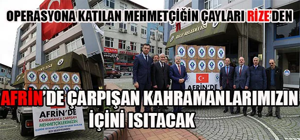 Rize Belediyesi öncülüğünde “Afrin’de Kahramanca Çarpışan Mehmetçiğimizin İçlerini Isıtacak Çay’lar ve Kalbi Dua’lar” yazısıyla paketlenen Çay’lar yapılan basın açıklamasıyla dualar eşliğinde yola çıktı.