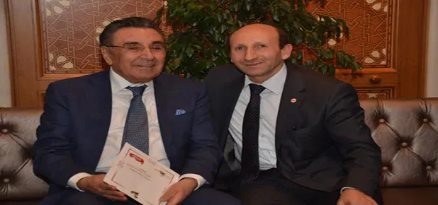Doğan'a Tanıtım Günleri davetiyesini GÜDEF Genel Başkanı Tahsin Söğüt verdi.