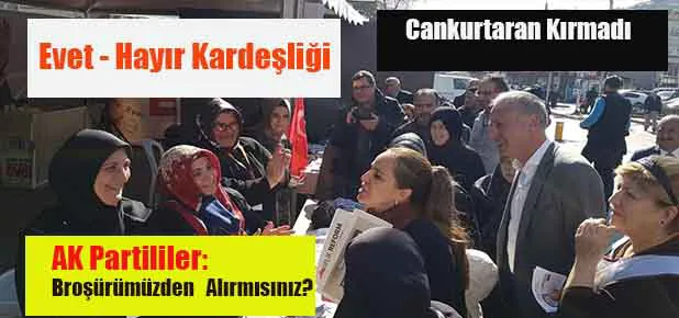 Eyüp sokaklarında “Hayır” propagandası yapan CHP Genel Başkan Yardımcısı Yasemin Öney Cankurtaran, evet çalışması yapan AK Partili gençlerin “Broşürümüzü alır mısınız?” ricasını geri çevirmeyerek birlikte hatıra fotoğrafı çektirdi. Standlarını ziyaret ederek kendilerini selamlayan Cankurtaran’ın “Bu ülke hepimizin” sözleri de AK Partili kadınlarca alkışlarla karşılandı.