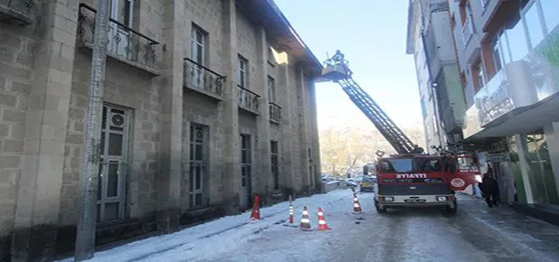 Bayburt Belediyesi İtfaiye Müdürlüğü ekipleri, çatılardaki buz sarkıtlarını temizliyor