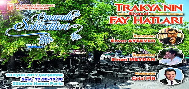 Lüleburgaz Belediyesi kültür etkinlikleri kapsamında ikincisi gerçekleştirilen ‘Çınaraltı Sohbetleri” programına katılan gazeteci-yazar Enver Aysever ve tarihçi Sinan Meydan, haber spikeri Celal Pir’in moderatörlüğünde halkla sohbet etti. Trakya’nın siyasal fay hatları konusunda soruları yanıtlayan konuşmacılar halkın bu tarz etkinliklere ihtiyacı olduğunun altını çizdiler.