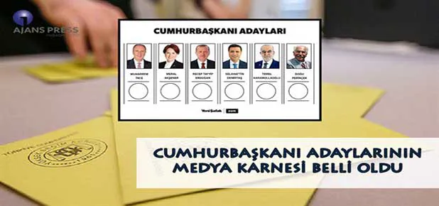 Medya takibinin öncü kurumu Ajans Press, seçimler öncesi medyanın nabzını tuttu. Ajans Press’in 1 Mayıs - 12 Haziran tarihleri arasında yazılı basın özelinde gerçekleştirdiği medya araştırmasında, en çok konuşulan adayın Cumhurbaşkanı Recep Tayyip Erdoğan olduğu belirlendi. Erdoğan, belirtilen tarih aralığında 46 bin 462 habere konu olarak medyanın en çok konuştuğu aday olmayı başardı.