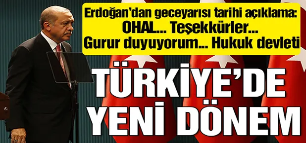 Bugün MGK'nın toplandığını ardından da Bakanlar Kurulu toplantısının gerçekleştiğini hatırlatan Erdoğan, “MGK olarak yaptığımız kapsamlı değerlendirme sonunda, darbe girişiminde bulunan terör örgütünün tüm unsurları ile ve süratle bertaraf edilebilmesi için ülkemizde anayasamızın 120. maddesi uyarınca OHAL ilan edilmesini hükümete tavsiye etme kararı aldık. Bakanlar Kurulu bu tavsiye doğrulusunda Türkiye'de üç ay süreyle OHAL ilan edilmesini kararlaştırdı. Bilindiği gibi anayasamızın 120. maddesi ülkede demokrasiyi, temel hak ve hürriyetleri ortadan kaldırmaya yönelik şiddet hareketleri olması durumunda OHAL ilan edilmesine imkan sağlıyor. OHAL ilanının amacı ülkemizde demokrasiye, hukuk devletine, vatandaşlarımızın hak ve özgürlüklerine yönelik bu tehdidi ortadan kaldırmak için gereken adımları en etkin ve hızlı bir şekilde atabilmektir. Bu uygulama kesinlikle demokrasiye, hukuka ve özgürlüklere karşı değildir. Bu değerleri koruma ve güçlendirme amacına yöneliktir. Yaşadığımız darbe girişimi Türkiye'de kimlerin canları pahasına demokrasinin ve hukuk devletinin yanında olduğunu, kimlerin de diktatörlük peşinde olduğunu ortaya koymuştur. Hükümetimiz, siyasi partilerimiz, STK'larımız, TSK'mızın emir komuta kademesi ve milletimiz tercihinin daima demokrasiden yana olduğunu göstermiştir. Bu vesile ile 15 Temmuz gecesinden itibaren meydanları doldurarak devletinin ve hükümetinin yanında olduğunu haykıran vatandaşlarıma şükranlarımı sunuyorum. Partisi, siyasi fikri, inancı ne olursa olsun tankların karşısında dikilen her bir vatandaşım benim gözümde Mehmet Akif'in ifade ettiği gibi ‘imandır o cevher ki ilahi ne büyüktür, imansız olan paslı yürek sinede yüktür.‘ Onlar gerçekten o imanları ile o tankların karşısında durdular ve şehadete koştuklarını haykırdılar. Namluların karşısında dimdik duran, bu noktada beraber yıllarca çalıştığımız arkadaşlarımızı da biz uğurladık. Önüne arkasına bakmadan, paletlerin altına yatan 32 yaşındaki bir hanım kardeşimiz bakıyorsunuz şehadete yürüyor. Bunlar bir bayanı tankla ezecek kadar alçak. Bu denli namussuz, bu denli vahşi. Ama o hanım kardeşim şehadet şerbetini yudumladı, oraya yürüdü. Durmadılar, ama milletimi de durmadı. Onlarca insan vurulduğu halde bulunduğu yeri terk etmeyen vatandaşlarımın her biri İstiklal Harbi kahramanlarımızın torunları olduklarını ispatlamıştır. Savaş uçakları, helikopterler tepesinde dolaşıp, bombalar atmasına, ağır silahlarla ateş etmesine rağmen sokakları, asker kılıklı teröristlerin hedef aldıkları yerleri boşaltmayan kardeşlerimin kahramanlığını ifade edecek kelime bulamıyorum. Darbe girişiminin bastırılmasının ardından başka birileri yeniden aynı cüreti gösteremesin diye günlerdir tüm şehirlerimizin meydanlarında demokrasi nöbeti tutan vatandaşlarımızın her biri isimlerini tarihe altın harflerle yazdırdıklarını bilmelidirler. Bugün baktım, saat 16.00'dan itibaren herkes Kızılay'a yürümeye başlamış. Şuanda yine binlerce insan Kızılay meydanında. On binler Konya'da meydanda. Biraz sonra tele konferansta onlara hitap edeceğim. Şurası çok önemli, Ankara'da Gölbaşı Özel Harekat Daire Başkanlığı Ankara Emniyet Müdürlüğü binalarında görev yapanlar başta olmak üzere darbe girişiminde bulunanların ağır saldırıları altında kalmalarına rağmen tereddüt göstermeden görevlerinin başına koşan, mücadele eden polislerimizin fedakarlıkları her türlü taktirin üzerindedir. TSK bünyesinde darbe girişimlerine karşı kararlı bir duruş sergileyen, bu uğurda şehit olan, yaralanan askerlerimizin sağlam duruşlarını milletimiz asla unutmayacak. Kendilerine yanlış emir veren, ‘artık komuta bizdedir' diyeni alnından öldürmek suretiyle, daha sonra kendisine şehit olan askerimizi, Niğdeli kardeşimi hayırla yad ediyorum. Valiliklerimiz ve belediyelerimiz başta olmak üzere darbe girişimlerini haber aldıktan itibaren tüm imkanları ile devletlerinin ve milletinin yanında yer alan kurumlarımızın yöneticilerini tebrik ediyorum. Aynı şekilde, darbe teşebbüsü karşısında millet iradesinin yanında saf tutan medya kuruluşlarımıza ve STK'lara şükranlarımı sunuyorum” şeklinde konuştu.