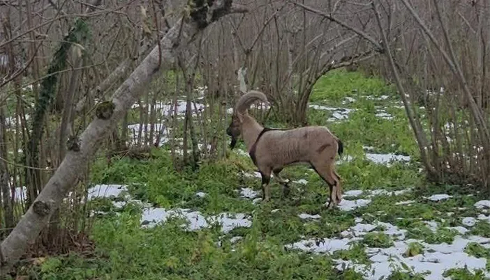Kış şartlarının etkisini artırmasıyla birlikte yiyecek bulmakta zorlanan yaban hayvanları yerleşim alanlarına inmeye başladı. Bu kez dağların ve sarp kayalıkların simgesi olan dağ keçisi, Ordu’da bir fındık bahçesinde görüntülendi.