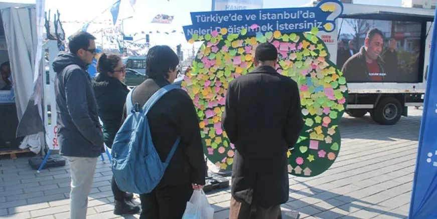 Parti tarafından İlçe meydanında kurulan ağaç maketi üzerinde yazılı Türkiye ve İstanbul’da neleri değiştirmek istersiniz sorusuna vatandaşların verdiği cevaplar dikkat çekti.