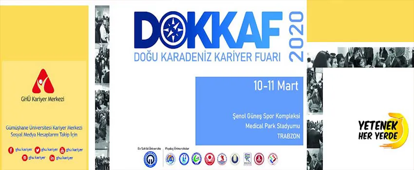 Cumhurbaşkanlığı İnsan Kaynakları Ofisi’nin tüm Türkiye’de organize ettiği kariyer fuarlarından birisi olan Doğu Karadeniz Kariyer Fuarı (DOKKAF 2020) Karadeniz Teknik Üniversitesi ev sahipliğinde Şenol Güneş Spor Kompleksi’nde gerçekleştirilecek. Bölgede yer alan dokuz üniversitenin paydaşlığında 10 -11 Mart 2020 tarihlerinde gerçekleştirilecek olan fuara katılanlara iş ve staj imkânı sunulacak.