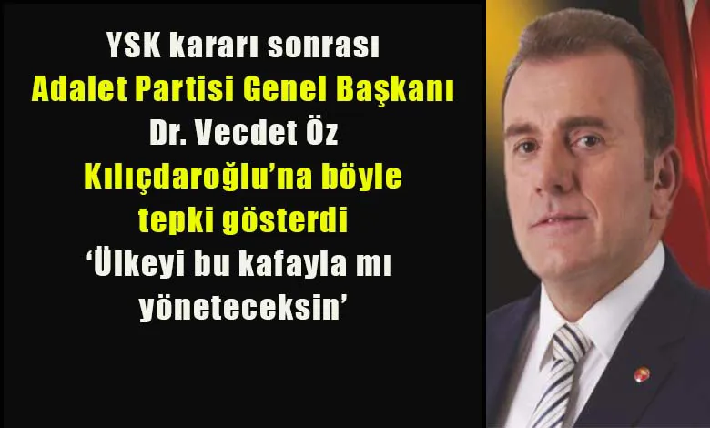 Yüksek Seçim Kurulu’nun Cumhurbaşkanı Recep Tayyip Erdoğan’ın üçüncü kez aday olmasına ilişkin olarak yapılan itirazları reddederek ‘yeniden aday olabilir’ kararı sonrası Ata ittifakı bileşenlerinden Adalet Partisi Genel Başkanı Dr. Vecdet Öz, karara tepki göstermeyen Millet ittifakı Genel Başkanı Kemal Kılıçdaroğlu’nun tavrını eleştirdi.