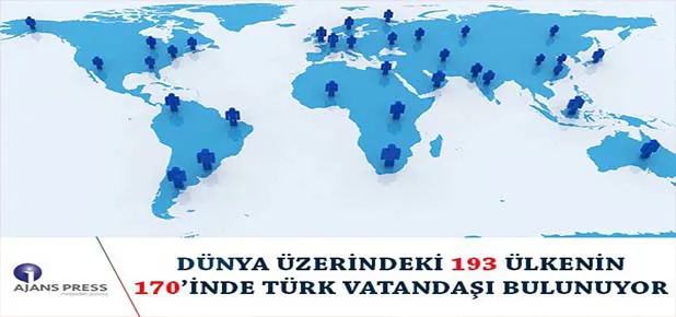 Medya takibinin öncü kurumu Ajans Press, dünya üzerinde Türklerin yaşadığı yerleri konu alan araştırmayı inceledi. Ajans Press’in Dışişleri Bakanlığı verilerinin yanı sıra Türkiye-Avrupa Eğitim ve Bilimsel Araştırmalar Vakfı (TAVAK) ve Türkiye İş Kurumu’ndan (İŞKUR) derlediği bilgilere göre, 193 ülkenin 170’inde Türk vatandaşların yaşadığı tespit edildi. Rakam olarak incelendiğinde 6 milyonun üzerinde olan vatandaş sayısının 5 milyonunun Avrupa ülkelerinde yaşadığı tespit edildi. Bunun yanı sıra, Türk vatandaşlarının çoğunlukla Kuzey Amerika, Asya, Orta Doğu ve Avustralya’da bulundukları anlaşıldı.