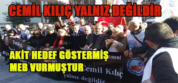 Eğitim - İş olarak altını çiziyoruz: Üyemiz olmasa dahi hiçbir eğitimciyi karanlık yobazların pençelerine bırakmayacağımız gibi, yoldaşımız Cemil Kılıç'ın da sonuna kadar yanındayız! Haklı ve doğru kavgamıza, dini siyasete alet edenler ile bunlara tetikçilik yapan satılmış kalemler kırılana kadar devam edeceğiz. Herkes öğrenecek ki sendika yöneticimiz ve iyi bir Din Kültürü ve Ahlak Bilgisi öğretmeni olan Cemil Kılıç, yalnız değildir."