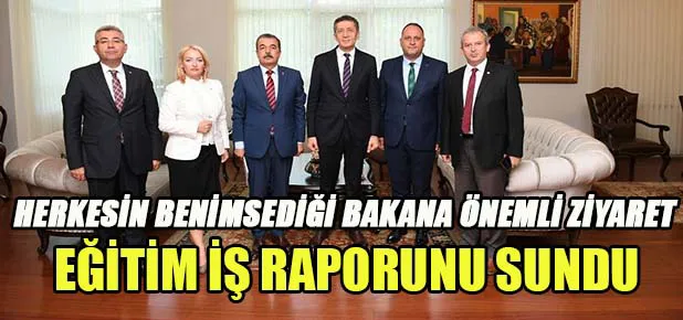 Eğitim - İş Genel Başkanı Orhan Yıldırım, beraberinde Merkez Yönetim Kurulu Üyeleri Ebru Sungar, Hüseyin Kara, Bilal Şener ve Suat Özkolay ile birlikte Milli Eğitim Bakanlığı tarafından yapılan değişiklik ve uygulamalar çerçevesinde çeşitli bilgiler edinmek üzere Milli Eğitim Bakanı Ziya Selçuk’u ziyaret ettiler. Ziyarette Bakan Selçuk’a eğitimde yaşanan sorunlar ve çözüm önerileri raporu sunuldu.