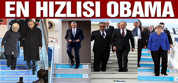 Bu yıl ülkemizin evsahipliği yaptığı G-20 Liderler Zirvesi için Türkiye’ye gelen dünya liderleri, Antalya Havaliman’ında uçaklarında inerken kameralar da kayıttaydı. Uçaktan en hızlı inen lider, ABD Başkanı Barack Obama olurken, en yavaşı ise eşi Emine Erdoğan ile birlikte Antalya’ya gelen Cumhurbaşkanı Recep Tayyip Erdoğan ve Suudi Arabistan Kralı Salman Bin Abdülaziz oldu. Almanya Başbakanı Angela Merkel ise G20 Liderler Zirvesi’ne katılmak üzere Antalya’ya en geç gelen lider oldu. Zirve’ye geç kalan Merkel’in ‘Geleneksel G-20 Aile Fotoğrafına’ yetişebilmek için uçaktan seri adımlarla indiği görüldü
