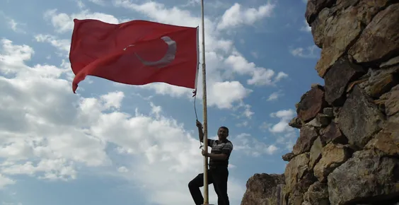 Torul kalesinde dalgalanan şanlı bayrağı Torul’lu belediye çalışanı Veysel Küçüköner dik yamaçlara aldırmadan değiştiriyor