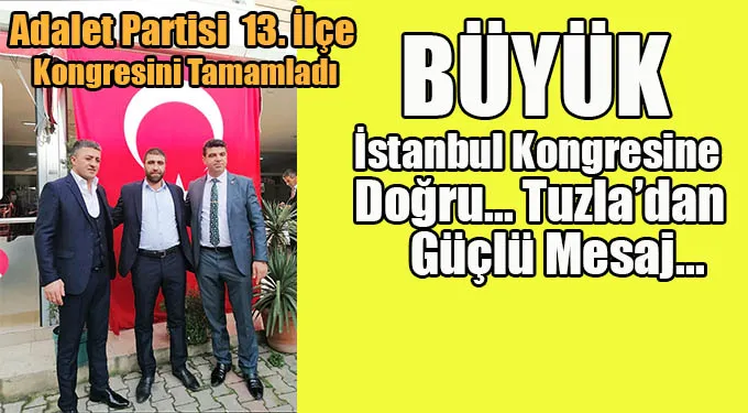 Canpolat, 'Tuzla ilçemiz İstanbul genelinde 13. kongre yaptığımız ilçe oldu. İnşallah sıra şimdi İstanbul büyük kongresinde her anlamda ses getirecek ve Adalet Partisinin yeniden şahlanışını ifade edeceğimiz kongremizin ardından güçlü bir şekilde yolumuza devam edeceğiz. Genel Başkanımız sayın Dr. Vecdet Öz'ün talimatları doğrultusunda üstlendiğimiz görevini gereğini yerine getirmenin mutluluğunu yaşıyoruz, ayrıca tüm partililerin ve yurttaşlarımızın yeni yılını da bu vesileyle kutluyor, selam ve saygılarımı sunuyorum' dedi.