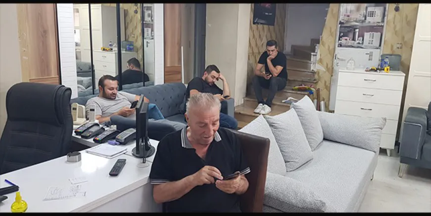 Durgunluktan şikâyet eden mobilya mağazası çalışanları zamanı telefonlarına bakarak geçiriyorlar.