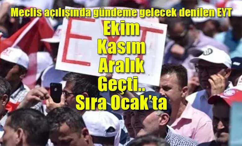 Milyonlarca vatandaşın beklediği Emeklilikte Yaşa Takılanlar (EYT) düzenlemesinde tarih değişti. Daha önce Çalışma ve Sosyal Güvenlik Bakanı Vedat Bilgin EYT’nin Aralık ayında meclise geleceğini söylemişti. AKP’den bugün yapılan açıklamaya göre EYT düzenlemesi takvimi Ocak ayında mecliste görüşülecek.