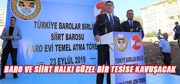 Türkiye Barolar Birliği Başkanı Av. Prof. Dr. Metin Feyzioğlu, Siirt Valisi Ali Fuat Atik, çok sayıda bölge baro başkanı ve avukatların da katılımıyla Siirt Barosu yeni hizmet binasının temelini attı. Feyzioğlu, “14 ay sonra hem baromuz hem de Siirt halkımız bir çok güzel tesise kavuşacak” dedi. Feyzioğlu, törenin ardından Siirt'li çocuklara da hediyeler verdi.