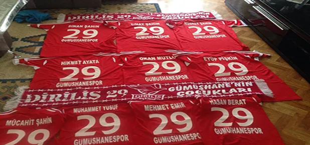 Gurbetçi Gümüşhaneli Sinan Şahin Diriliş 29’un sosyal medya üzerinden görüştüğü yetkilisi Engin Demir’den çok beğendiği taraftar logolu formaları istedi. Bu anlamlı isteği karşılıksız bırakmayan Diriliş 29 taraftar grubu üzerinde isimleri bulunan gurbetçilere toplam 10 adet formayı hediye etti.