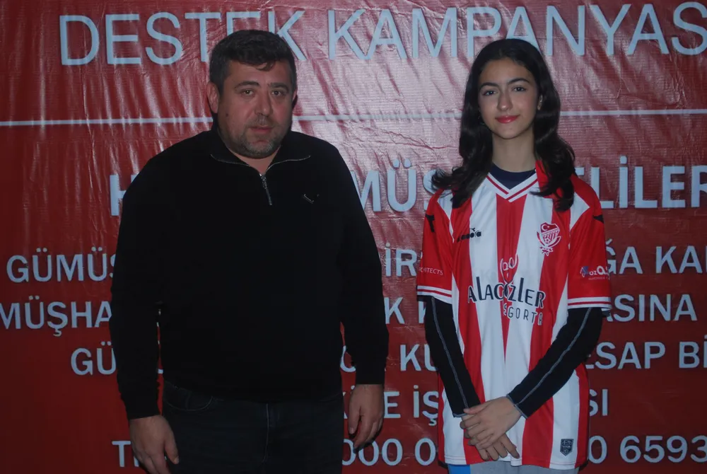 Zümre Celep ailesinin satın aldığı formayı giyerek Gümüşhanespor Başkanı Erol Ocaklı ile birlikte günün anısına bu karede yer aldı