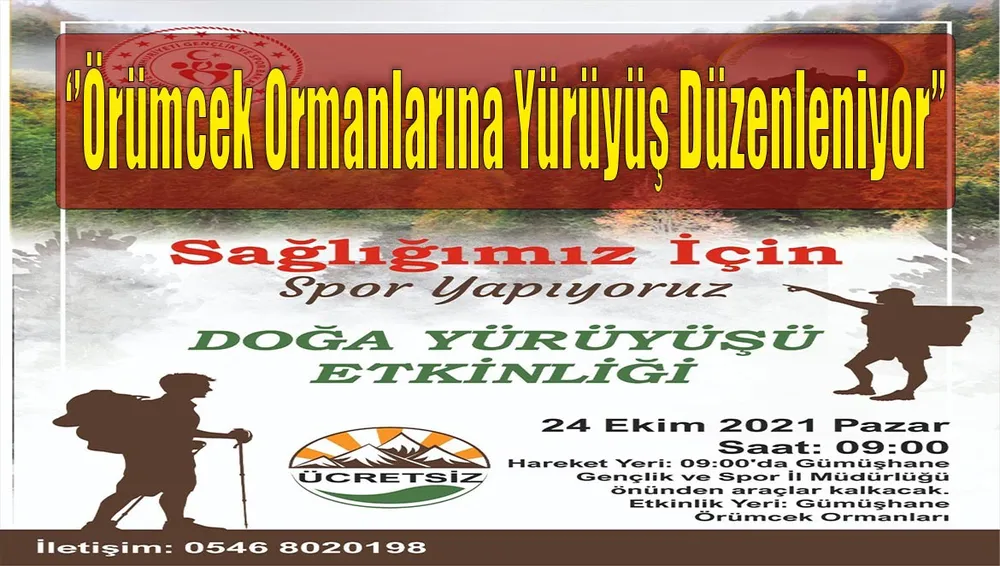 Gümüşhane Gençlik ve Spor İl Müdürlüğü ile Gümüşhane Dağcılık ve Doğa Sporları Kulübü (GÜDAK) tarafından, Kürtün ilçesi Örümcek Ormanlarında bulunan, Avrupa ve Kafkaslar'ın en uzun ladin ve köknarların bulunduğu alana yürüyüş düzenlenecek.