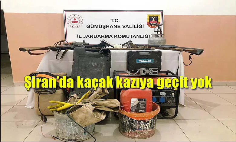 Gümüşhane İl Jandarma Komutanlığı ve Şiran İlçe Jandarma Komutanlığı ekiplerince Şiran İlçesi Seydibaba Köyü yakınlarında 16 Aralık 2022 tarihinde kaçak kazı yapıldığı bilgisi alınmış Şiran Cumhuriyet Savcılığının talimatıyla şüpheliler N.K., M.Ş., Ö.Ş., ve C.Ç.’nin ikametleriyle Y.Ç.’nin ikamet ve işyerinde adli aramada yapılmış, arama sonucunda; 3 adet ruhsatsız av tüfeği, 2 adet kurusıkı tabanca, 6 adet piyade tüfeği fişeği, 1 adet jeneratör, 1 adet hilti, 2 adet hilti ucu, 1 adet güç kaynağı, 1 adet ip bağlanmış şekilde kova, 2 adet emniyet kemeri ele geçirilerek el konulmuş, Cumhuriyet Savcısının talimatıyla 5 şüpheli gözaltına alınarak savcılık işlemlerinin ardından serbest bırakıldı.