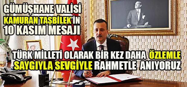 Gümüşhane Valisi Kamuran Taşbilek Türkiye Cumhuriyetinin Kurucusu Ulu Önder Mustafa Kemal Atatürk’ün vefatının 82. yıldönümünde bir mesaj yayınladı. Vali Taşbilek’in mesajı şöyle: