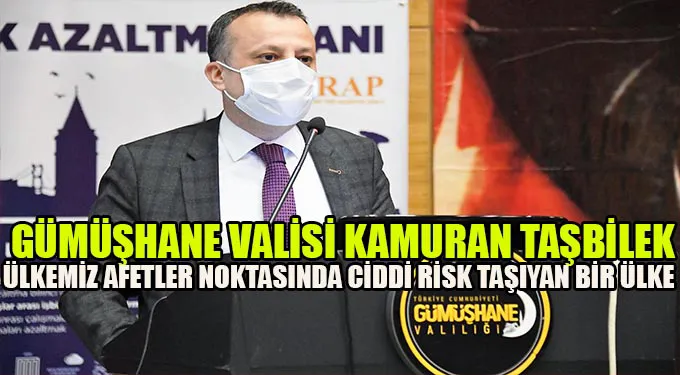 Gümüşhane Kültür Merkezinde geniş katılımlı olarak düzenlenen İl Afet Risklerini Azaltma Planı toplantısında ilgili kurum temsilcilerinin yaptıkları sunumların ardından değerlendirmelerde bulunan Gümüşhane Valisi Kamuran Taşbilek, “Ülkemiz afetler noktasında ciddi risk taşıyan bir ülke. Afetlerden dolayı oluşacak zararları en aza indirebilmek için İçişleri Bakanlığımız, afet farkındalığı ile ilgili bir eğitim programı başlattı. İlk yapılan programda 81 il valisine bizzat İçişleri Bakanımız Sayın Süleyman Soylu’nun hitapları oldu.