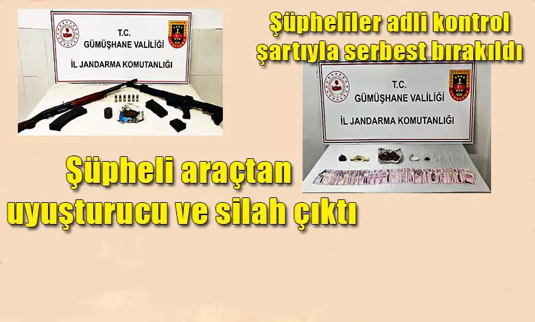 Gümüşhane İl Jandarma Komutanlığı Merkez İlçe Jandarma Komutanlığı ve KOM Şube Müdürlüğü ekiplerince yapılan çalışmalar sonucunda İl Merkezinde ikamet eden S.K. ve A.K.G.’nin içinde bulunduğu ticari otomobil ve Y.K. ve E.D.’nin içinde bulunduğu ticari taksi ile uyuşturucu madde sevkiyatı yaptıkları bilgisi alınması üzerine 27 Kasım günü saat: 23.00 sıralarında araçlar durdurularak şahıslar ve araçlarda yapılan kontrolde, uyuşturucu madde arama köpeği Altın tepki verdi. Durumla ilgili Gümüşhane Cumhuriyet Başsavcılığından arama kararı alınması sonrası yapılan arama neticesinde, ticari taksi içerisinde, yolcu olarak seyahat eden Y.K.'nın oturduğu koltuk altında, 50 gr kubar esrar, 15 gr toz esrar, 2 gr metamfetamin olduğu değerlendirilen uyuşturucu ve uyarıcı maddeler ile A.K.G'nin üzerinde, uyuşturucu ve uyarıcı madde ticaretinden elde edildiği değerlendirilen, 13.625 TL para tespit edilerek muhafaza altına alındı. Mevcut olayla bağlantılı olarak 28.11.2022 günü şüpheli A.K.G.’in Torul ilçesi Budak köyündeki ikametinde Torul İlçe Jandarma Komutanlığı, KOM Şube Müdürlüğü ekipleri ve Uyuşturucu Arama ve Bomba Arama Köpeği unsurlarının katılımlarıyla yapılan aramada 2 adet av tüfeği, 3 adet av tüfeği şarjörü, 6 adet mühimmat ile 30 gr esrar ile esrar öğütücü ele geçirilerek el konuldu, şahıslar çıkarıldıkları mahkeme tarafından adli kontrol şartıyla serbest bırakıldı.