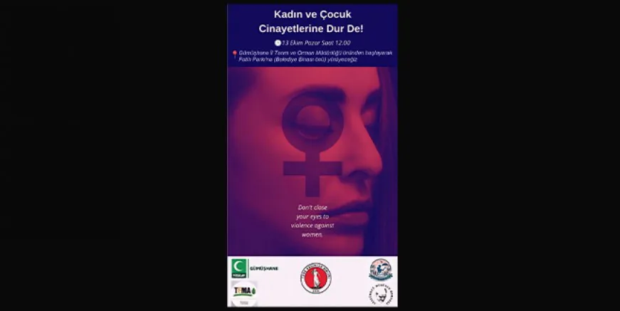 Etkinlik, 13 Ekim Pazar günü saat 12:00’de Gümüşhane Tarım İl Müdürlüğü önünden başlayacak ve Belediye Binası önünde yapılacak basın açıklaması ile sonlanacak. Yürüyüş boyunca kadın ve çocukların güvenli bir geleceğe sahip olması için taleplerimizi dile getireceğiz. Hep birlikte “Dur” diyerek, adaleti ve barışı savunacağız.