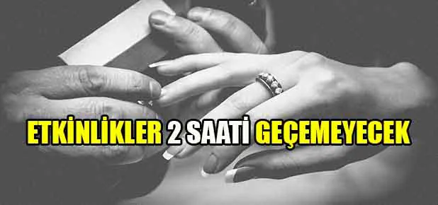 Vali Kamuran Taşbilek başkanlığında gerçekleştirilen toplantıda alınan karar sonrası il, ilçe merkezi, mahalle ve köy sokaklarında, düğün salonları ve kır bahçelerinde yapılacak düğün, gelin alma, kına, nişan, sünnet düğünü gibi tüm etkinlikler 2 saati geçmeyecek şekilde yapılacak.