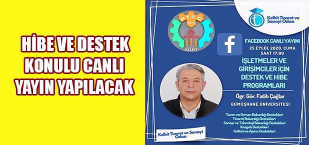 GÜMÜŞHANE / GÜNDOĞUMU Kelkit Ticaret Odası 25 Eylül (Cuma) günü saat 17:00’den itibaren sosyal medya facebook sayfasından Gümüşhane’deki İşletmeler ve Girişimciler için destek ve hibe programları konulu canlı yayın yapacak. Kelkit Ticaret Odası Başkanlığından yapılan açıklama da, katılımın herkese açık olacağı ve online olarak soru sorulabileceği ifade edildi.