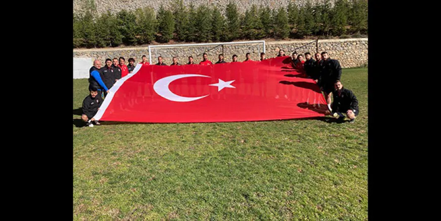 Futbolcular ve teknik heyet antrenman öncesi dev Türk Bayrağı açtı.