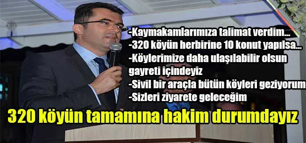 “Hem köylerimizde hem de il merkezi ve ilçelerimizde birlik ve beraberlik içerisinde önemli yatırımlara imza atmaya gayret ediyoruz. İl Özel İdaresi Genel Sekreterimiz Ekrem Akdoğan ve ekibine de çok teşekkür ediyorum. Fedakâr bir ekibimiz var. 320 köyün tamamına hâkim durumdayız, hangi köyde hangi sorunlarımız var biliyoruz. İmkânlarımız ölçüsünde de hizmetlerimizi yerine getireceğiz. Bunların lafta kalmadığını da görüyorsunuz, göreceksiniz. Sivil bir araçla bütün köyleri geziyorum. Kimseye haber vermeden bizzat eksiklikleri yerinde görüyorum. İşlerimizi tamamladıktan sonra da haber vererek köylerinizde sizleri ziyaret edeceğim.” dedi.