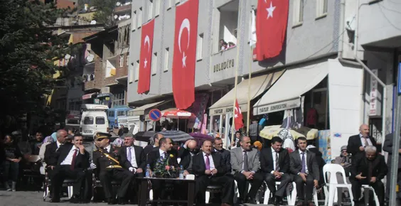 Belediye başkanı Selami Bostan ve mülki erkânın bulunduğu alanın hemen arkasında görülen Türk Bayraklarının bulunduğu kısımda hiçbir Atatürk resminin yer almaması dikkat çekti.